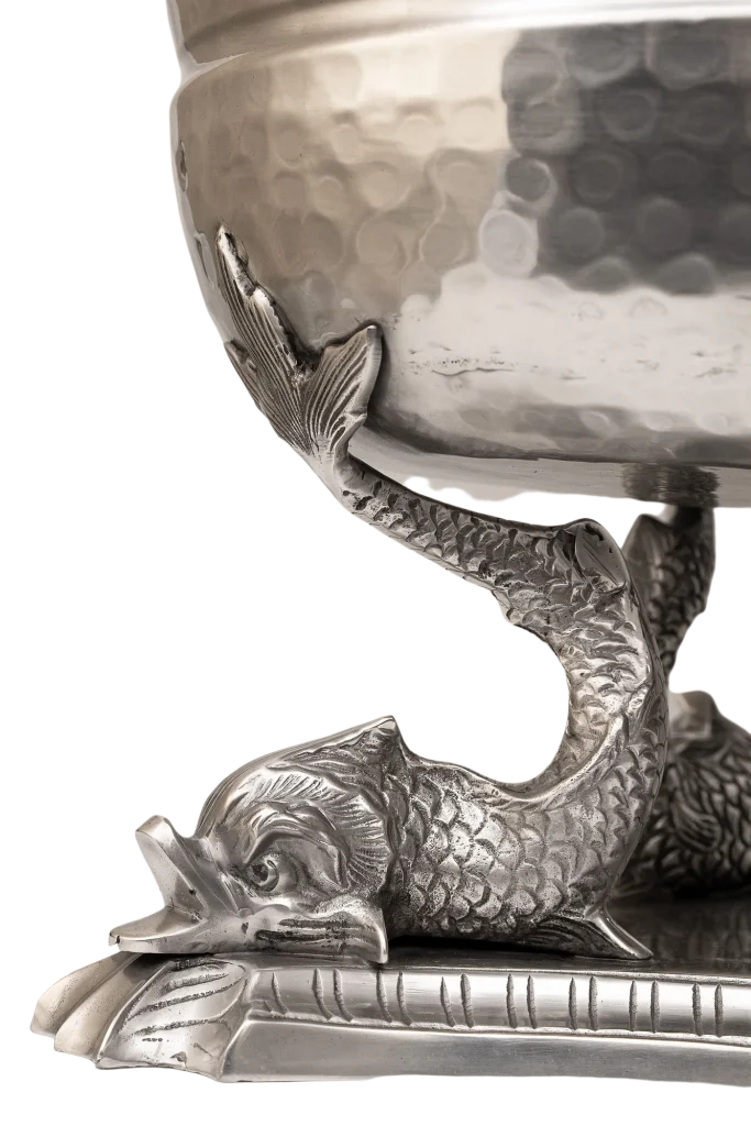 An elegant, large pewter silver plated wine cooler bucket suspended on a base off 3 koi fish, handmade by artisans in India.