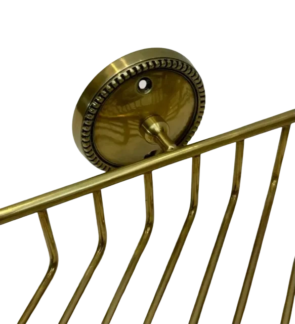 An elegant brass wall mounted corner storage basket, perfect for a shower!