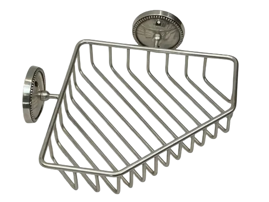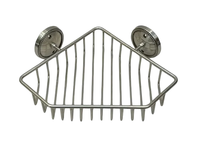 An elegant silver pewter plated wall mounted corner storage basket, perfect for a shower!