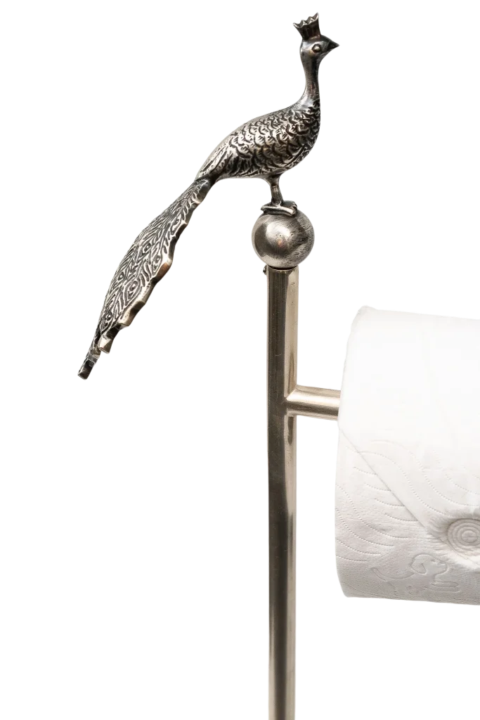 An elegant, hand crafted silver pewter plated floor standing toilet roll holder and organiser.