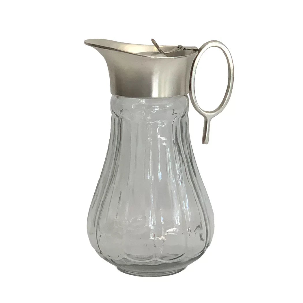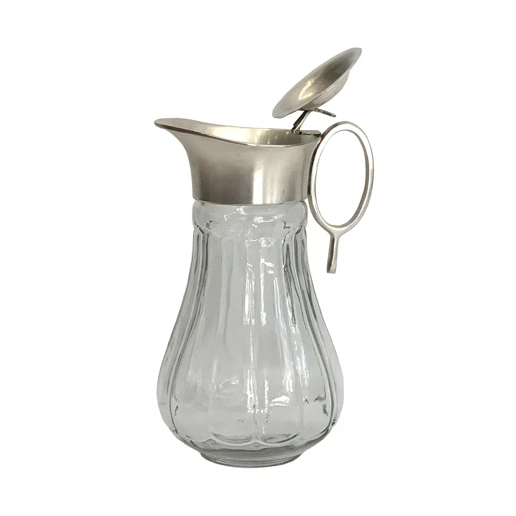 An elegant glass and silver pewter plated jug with a flip-open top.