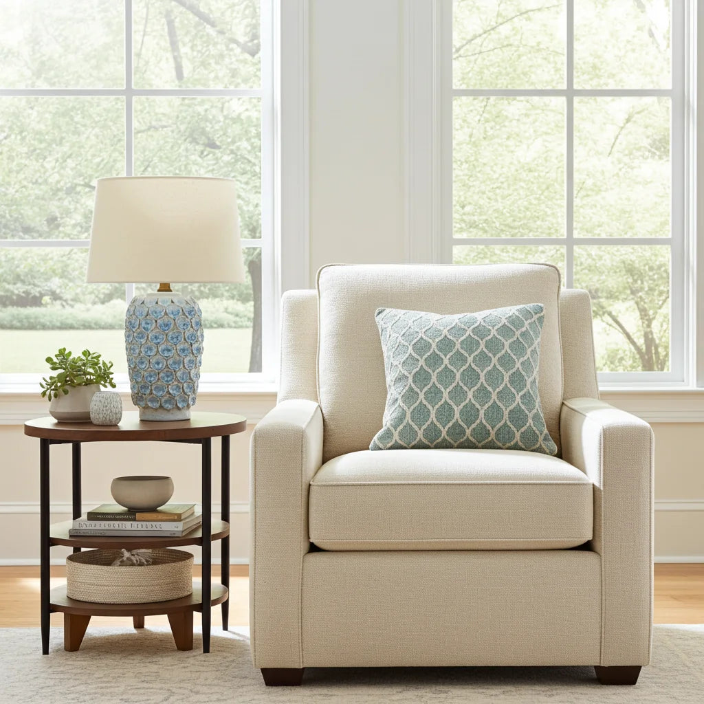 Light your space and create atmosphere in style with this stunning ceramic table lamp with a decorative beige shade included.