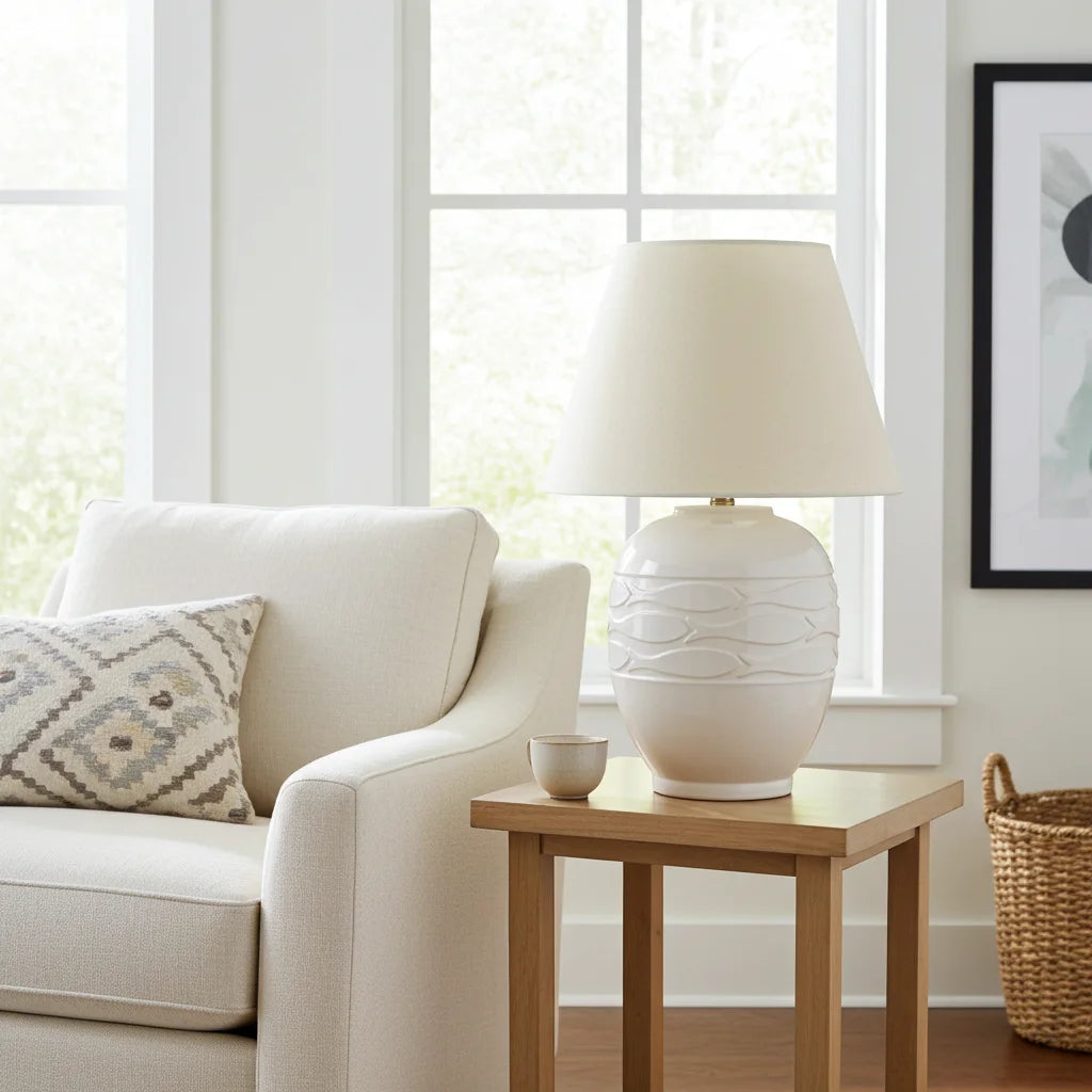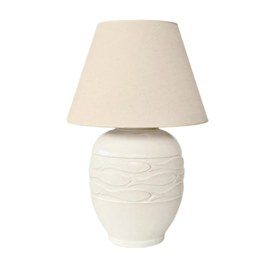 Light your space and create atmosphere in style with this stunning ceramic table lamp with a decorative beige shade included.