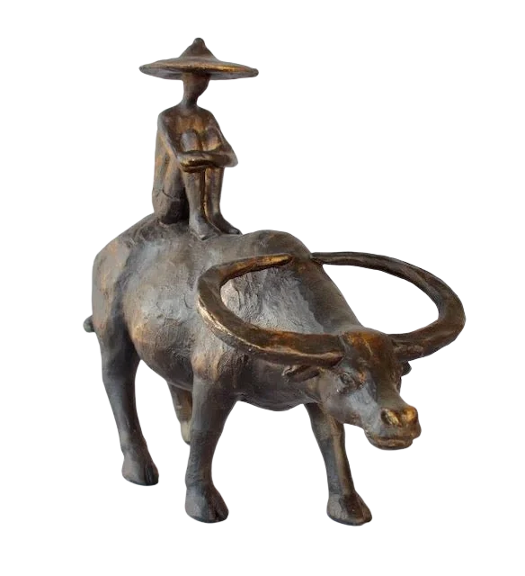 A beautiful resin ornament with a hand-sculpted finish, depicting a man riding a water buffalo.