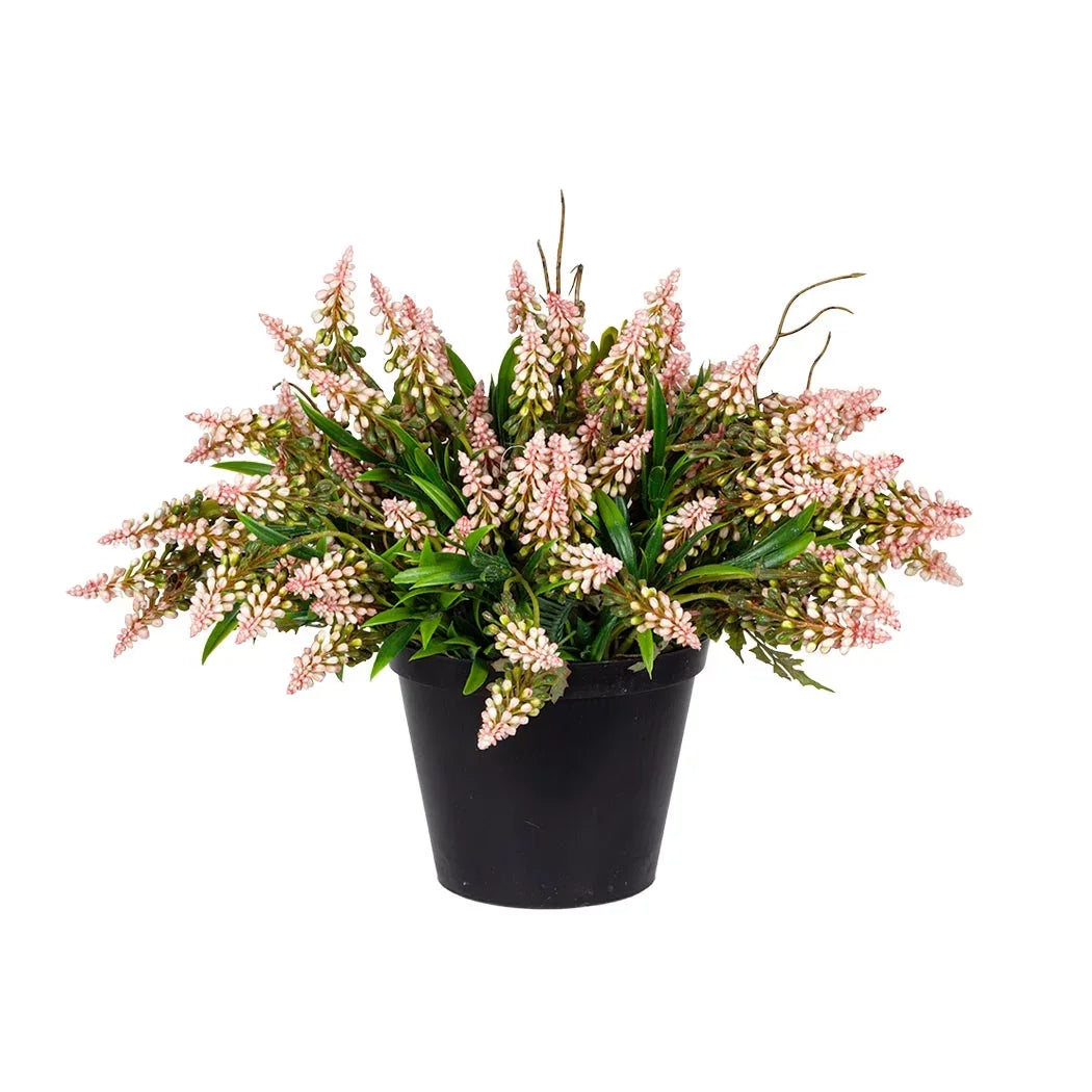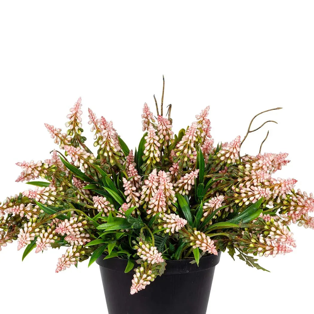 A stunning arrangement of faux hyacinths buds finished with various green leaves. A very full plant!