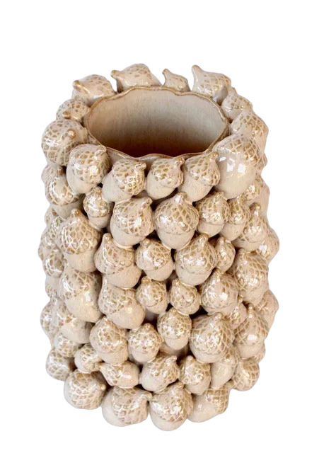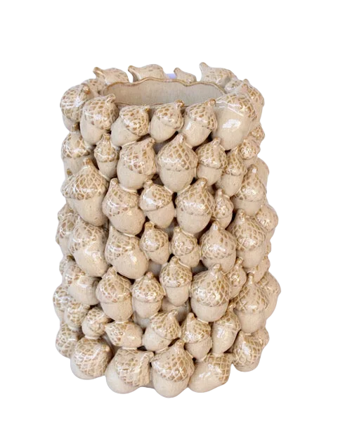 An expertly crafted ceramic vase, decorated all around in small ceramic acorns.
