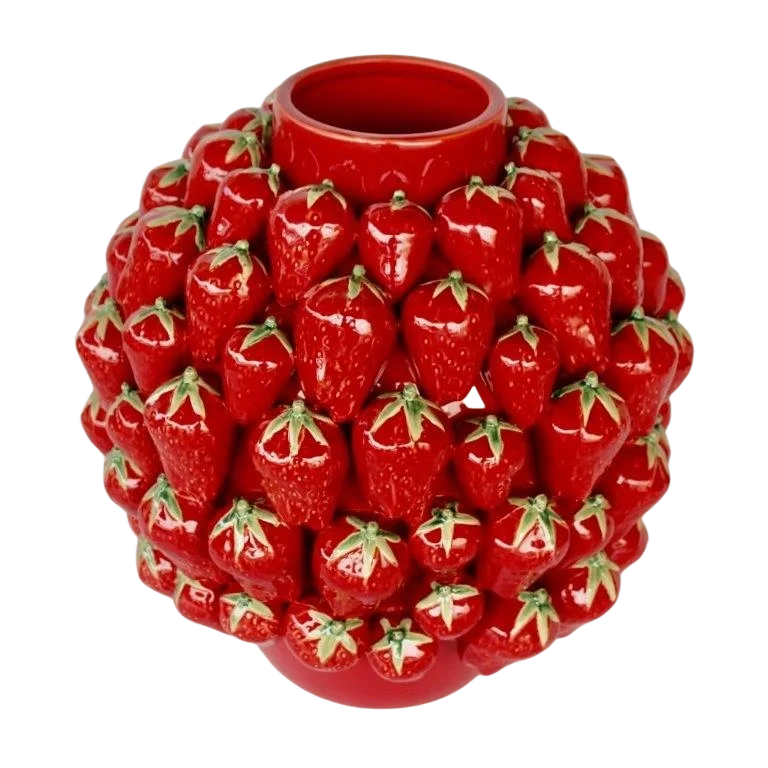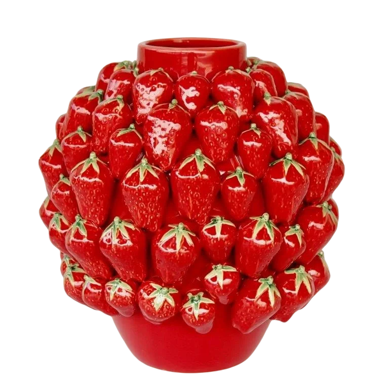A large and majestic ceramic vase covered in tons of ceramic strawberries.