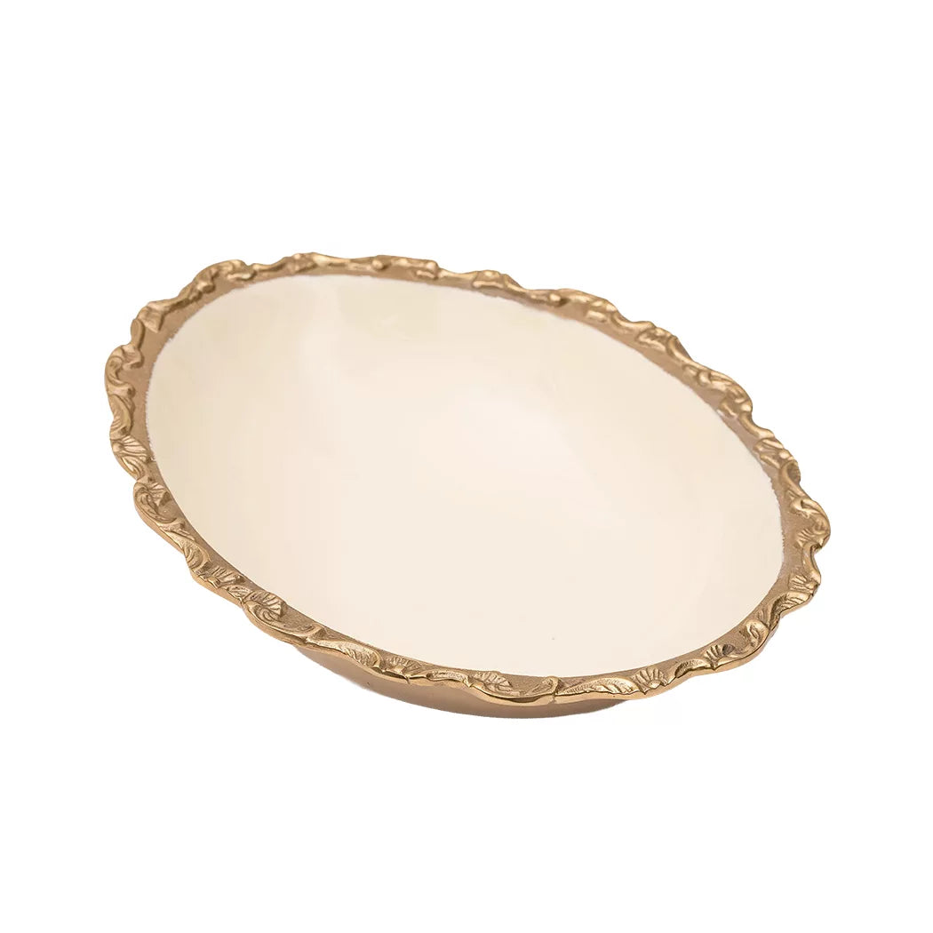 A beautiful brass and enameled, hand crafted oval bowl with a slight "wonky" shape and lovely decorated rim.